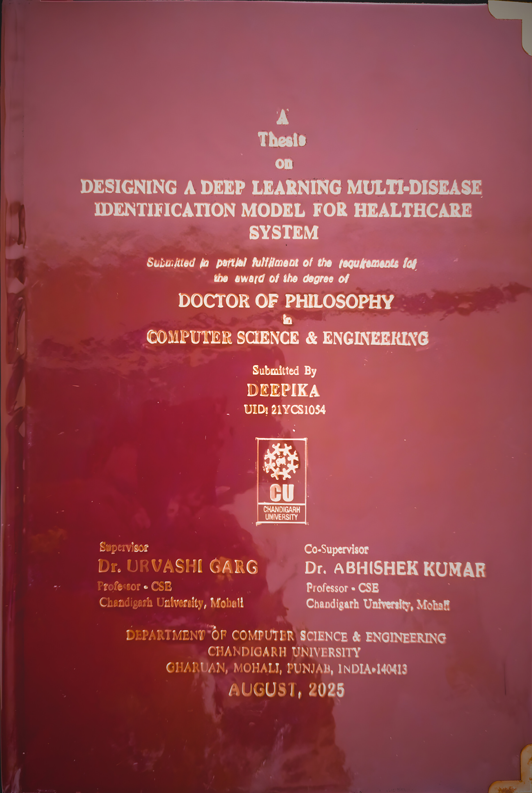 - Deepika, PhD Scholar (Co –Supervisor) Chandigarh University, Punjab, India Degree Awarded . Title of Thesis –Designing a deep learning model for multi-disease identification within the healthcare system [https://www.linkedin.com/in/er-deepika-a5653922a/ ]
